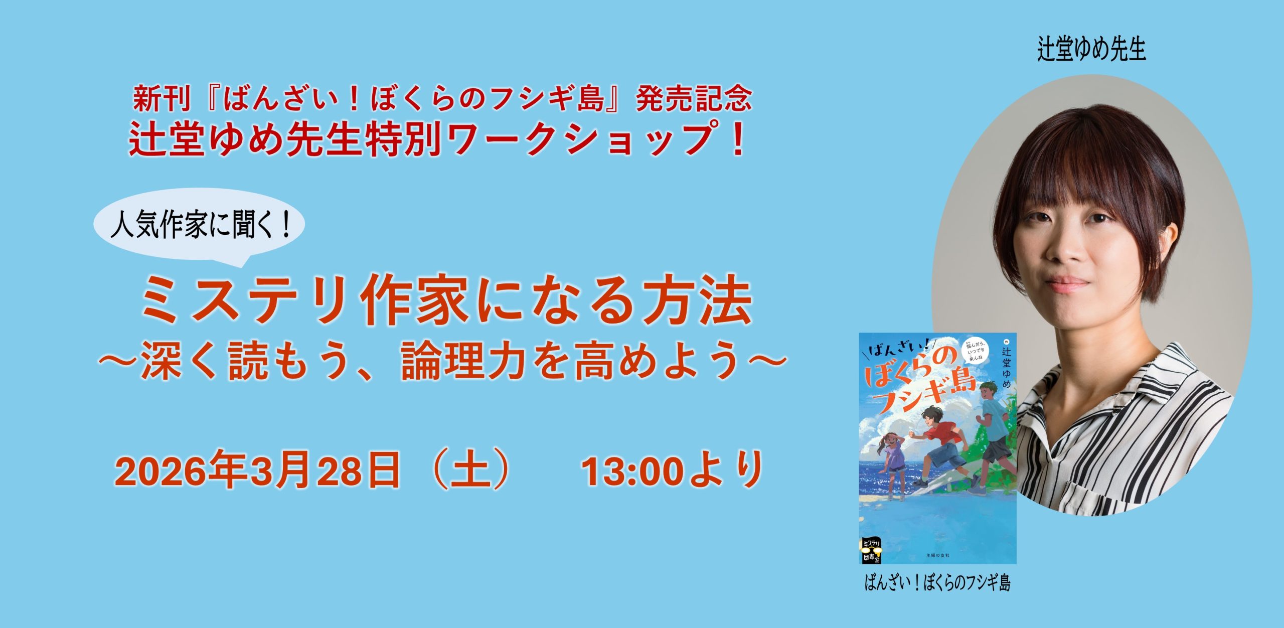 Gallery Bイベント 開催前2026.03.28 Sat - 2026.03.28 Sat【小学生対象】【辻堂ゆめ先生特別ワークショップ】人気作家に聞く! ミステリ作家になる方法 〜深く読もう、論理力を高めよう~